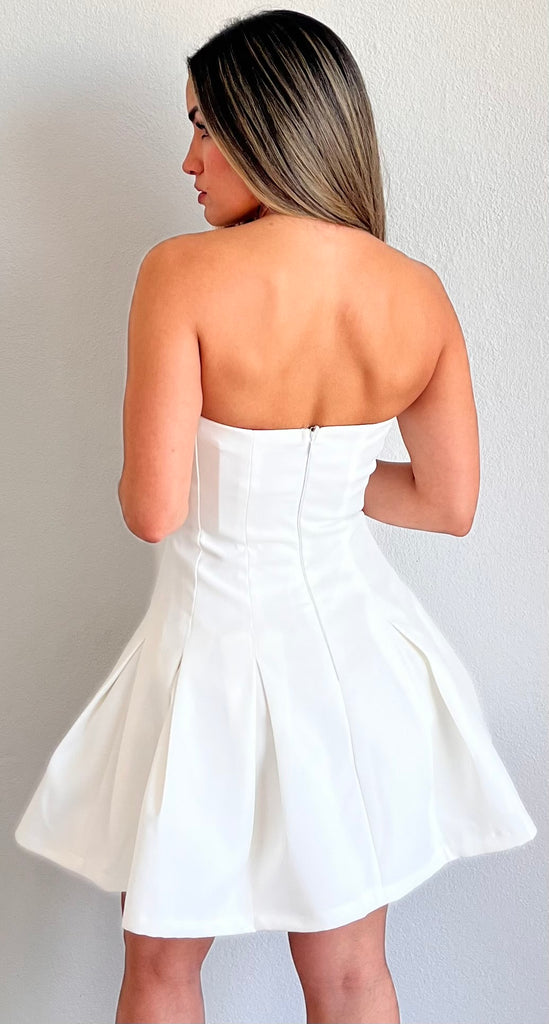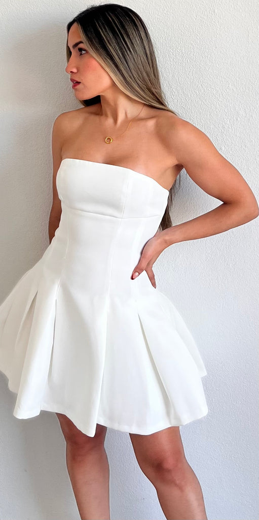 featuring Strapless Top, Fitted at the Waist and Flare Skirt in a White Fabric.