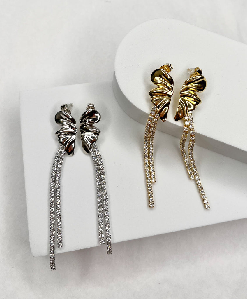 Elevate your look with these statement drop earrings featuring a sculpted leaf-inspired design paired with cascading pavé crystal strands. The combination of textured metallic detail and delicate sparkle creates a perfect balance between bold and elegant.