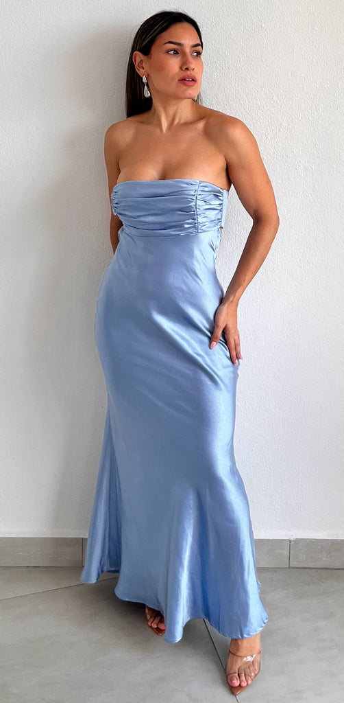 featuring Draped Strapless Top, with Cowl Back Detail, Fitted at the Waist and Loose Long Skirt in a Soft Satin Fabric.