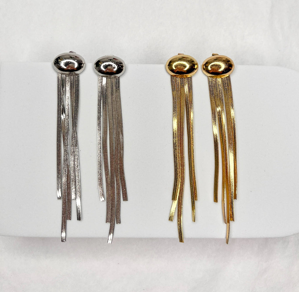 Turn heads with these bold fringe drop earrings designed to move beautifully with every step. Featuring a polished oval stud and cascading chain fringe, these earrings bring a perfect mix of elegance and drama. Lightweight yet eye-catching, they add instant glamour to both evening outfits and elevated casual looks.
