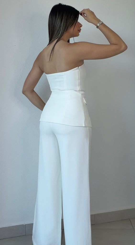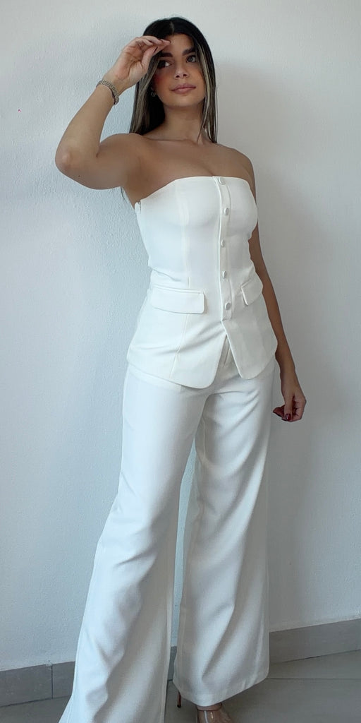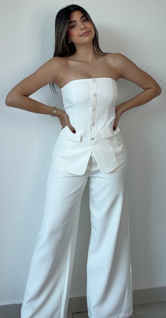 featuring Step into effortless sophistication with our elegant two-piece trouser set. This chic ensemble features a structured strapless top with front button detailing, designed to flatter and enhance your silhouette. The top includes a hidden side zipper for a seamless and secure fit.