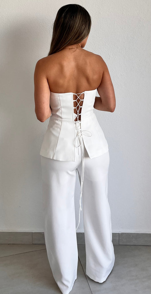 featuring Strapless Peplum Corset Top with High Waist Long Trousers Pants in a Soft White Fabric.