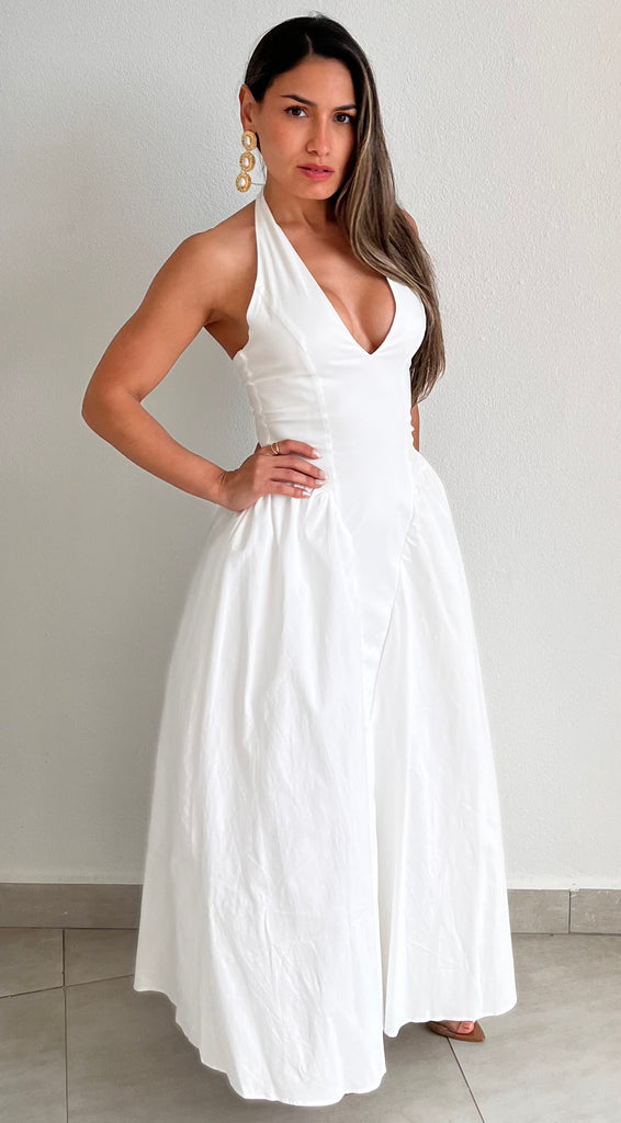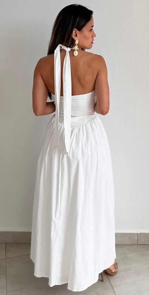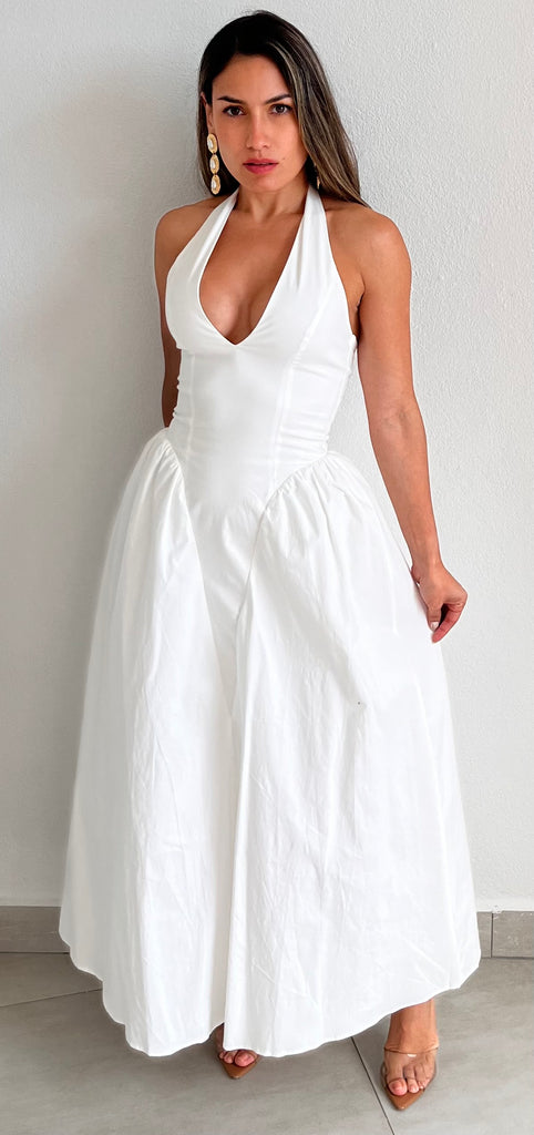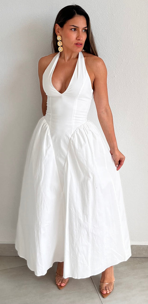featuring Halter Top, Fitted at the Top and Waist with Flare Midi Skirt in White Fabric.