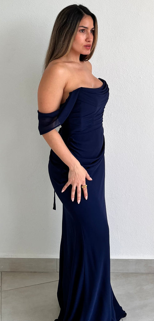 featuring Draped Off-The-Shoulder Top Fitted at the Top and Waist and Draped Long Skirt in a Soft Delicate Chiffon Fabric.
