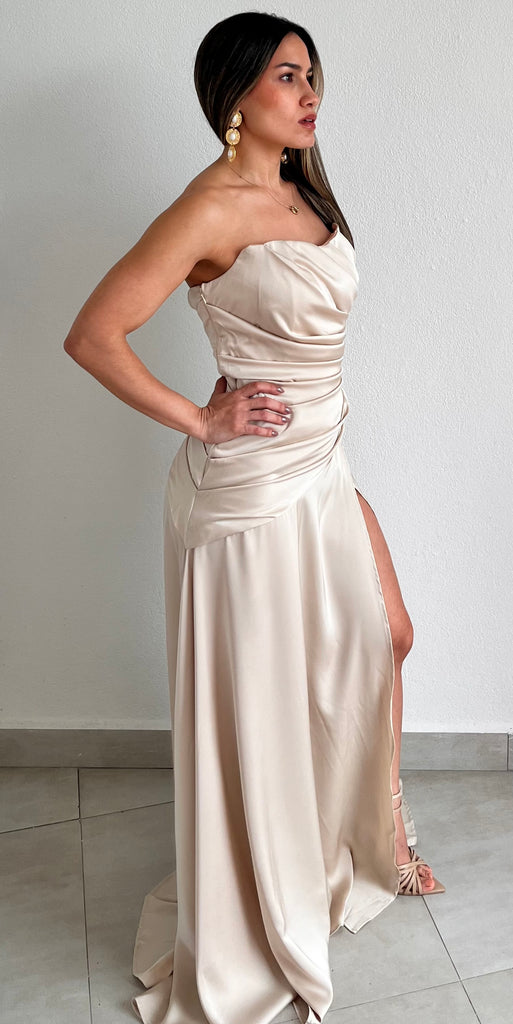 featuring Strapless Top, Draped at the Top, Waist & Hips with Flare Open Slit Skirt in a Satin Soft and Delicate Fabric.