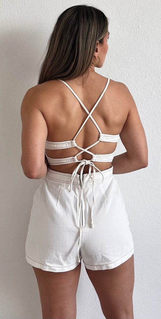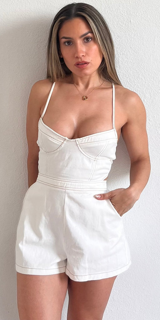 featuring Heart Cut Top with Spaghetti Straps Crossed at the Back, Fitted at the Waist and Shorts with Pockets in a Denim Fabric.