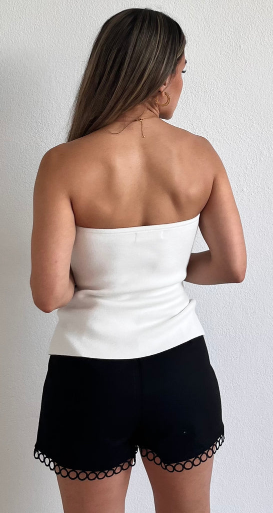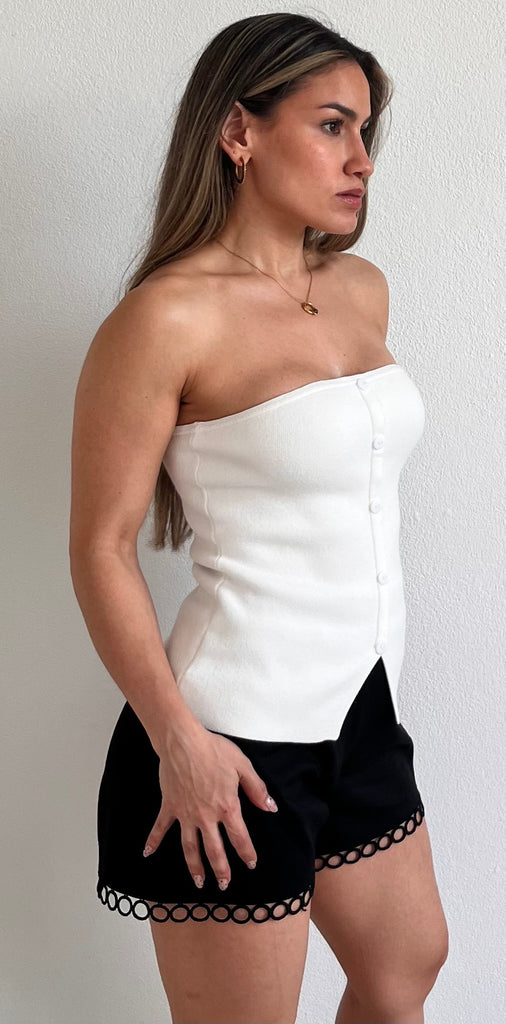 This Strapless button-front top is a timeless statement piece designed to flatter your silhouette. Featuring a structured yet comfortable fit, it showcases a clean strapless neckline and a subtle front slit detail for a modern, feminine touch.