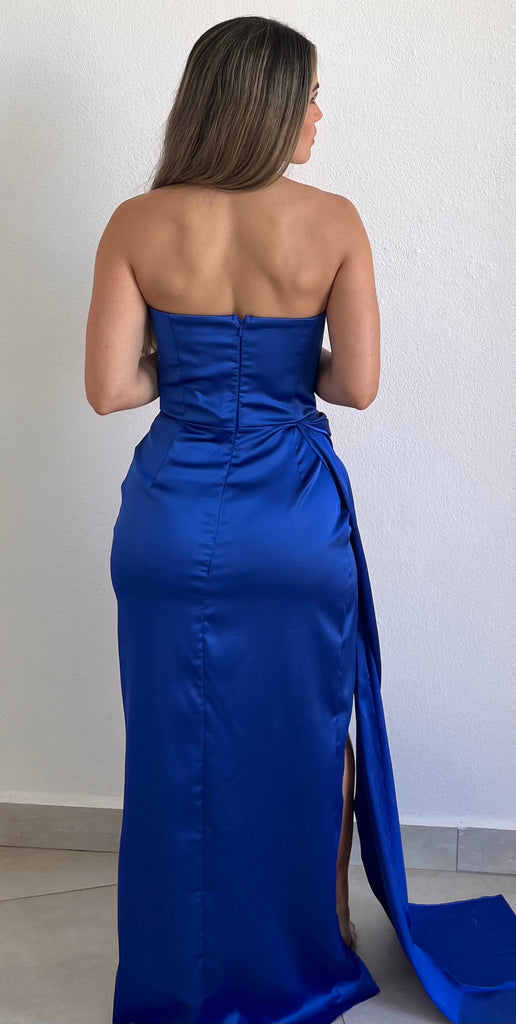 featuring Strapless Top, Fitted at the Top & Waist with Draped Detail at the Hips and Open Slit in a Satin Olive Fabric.